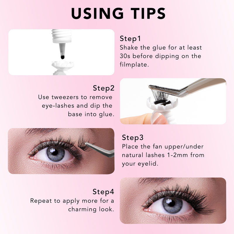 Ansøgningsprocessen er hurtig og let. Begynd med at vælge dine ønskede vippeklynger og lægge dem ud på en flad overflade. Påfør derefter en lille mængde af vores DIY -vippeklynglim på bunden af hver klynge. Tillad DIY -vippeklynglimet for at tørre i et par sekunder, og tryk derefter forsigtigt klyngerne på dine naturlige vipper.